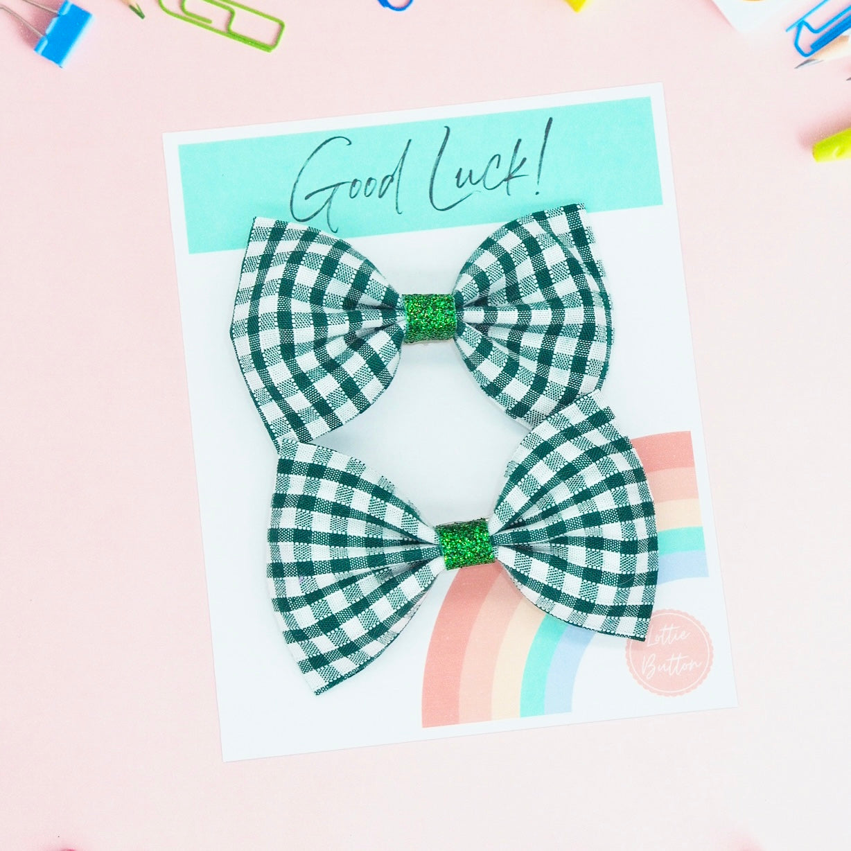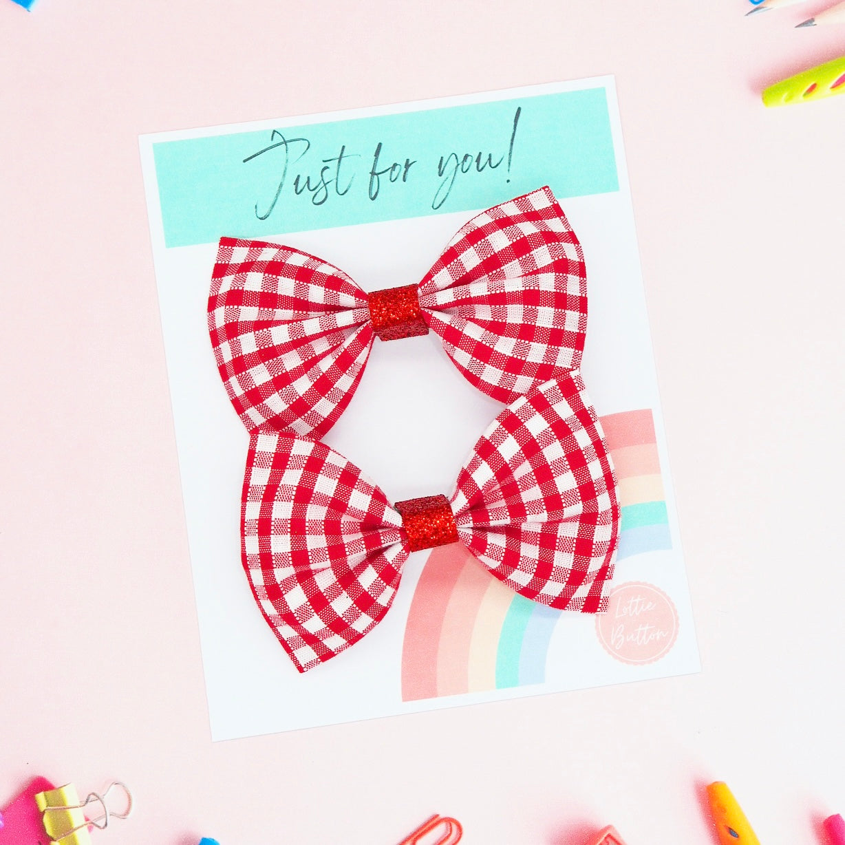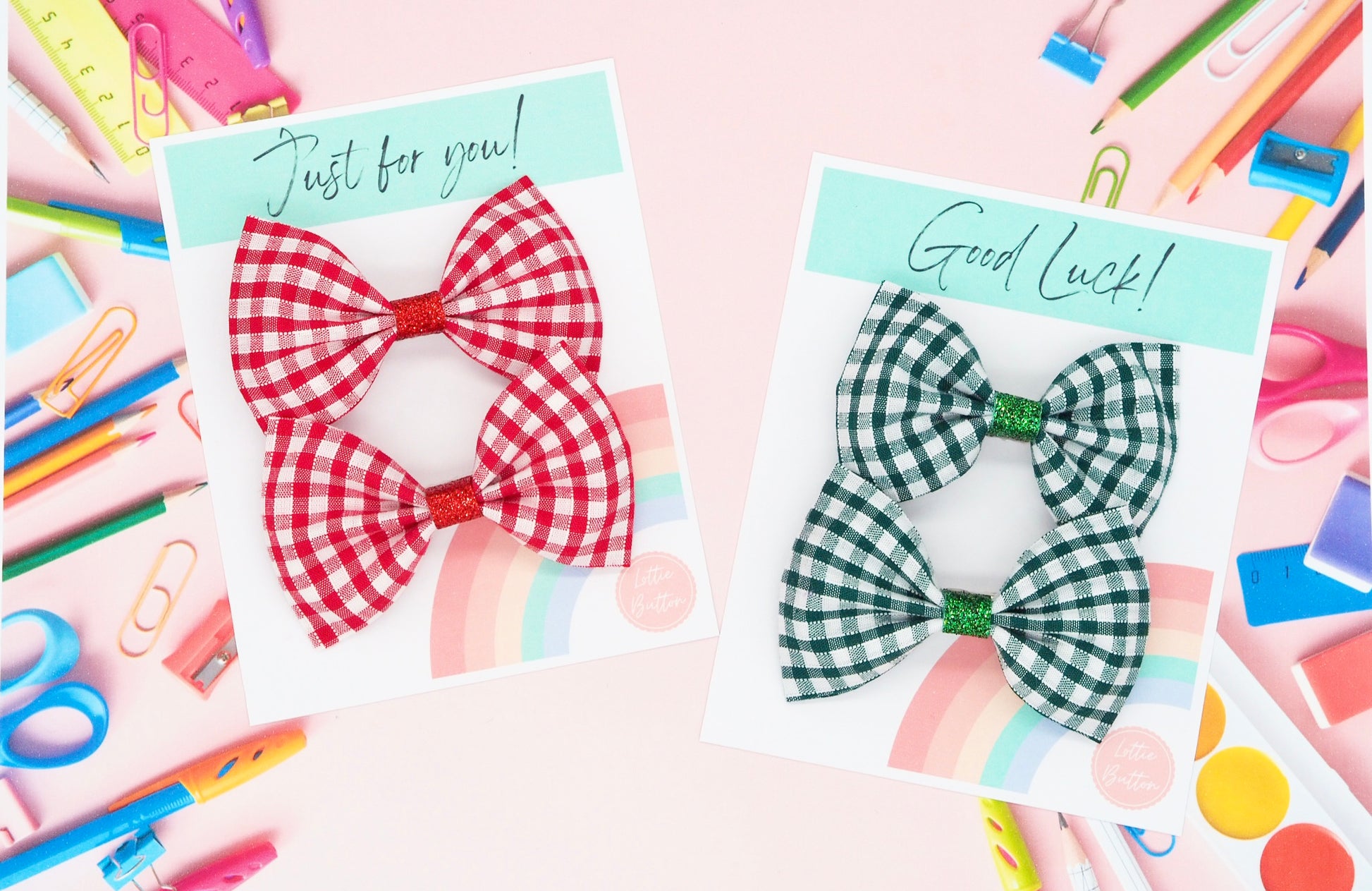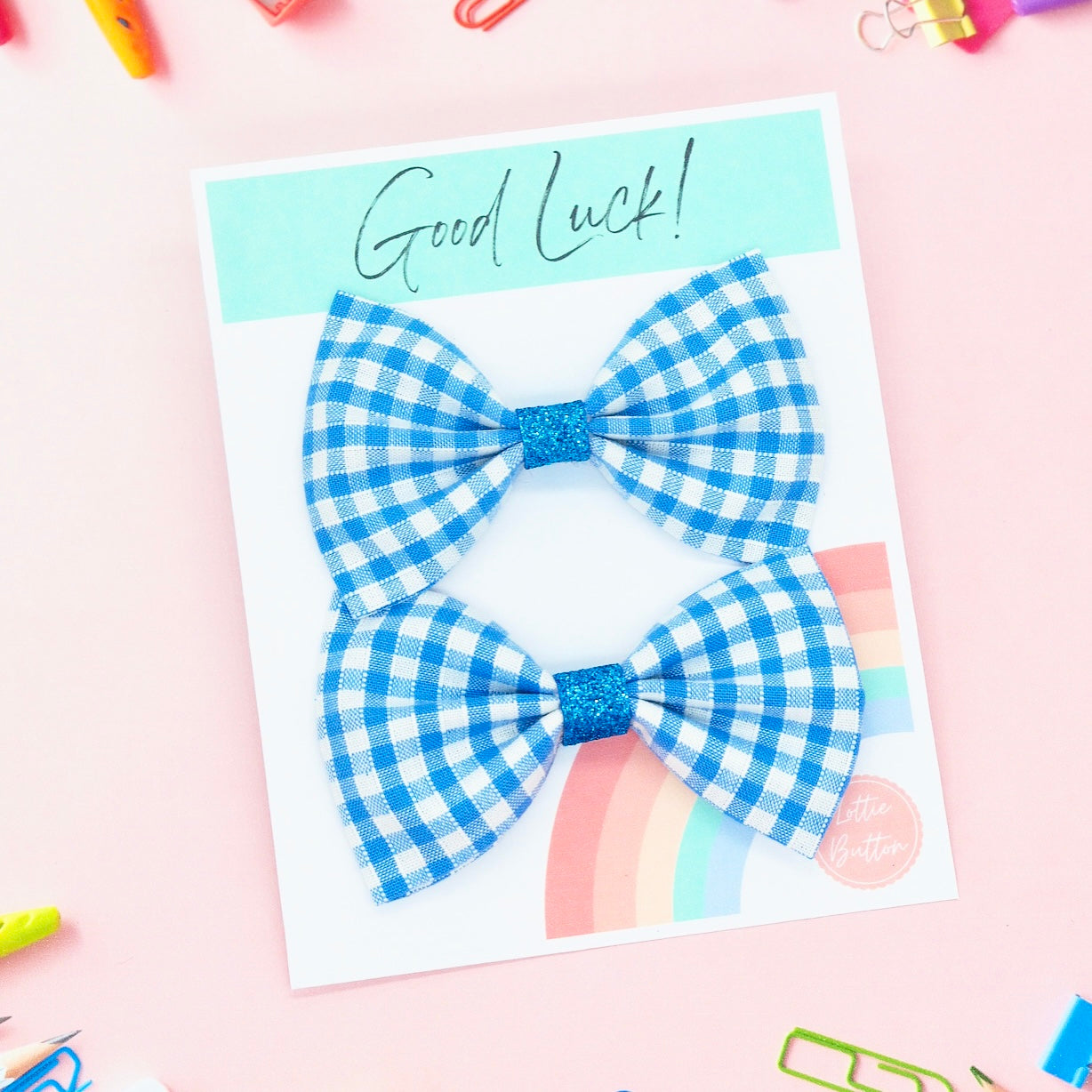 These gingham school bows are available in blue, red or green, they can be made on either alligator clips or hair bobbles and come presented on a backing card reading either 'Good Luck' or 'Just for you', please select which option you'd like when checking out.