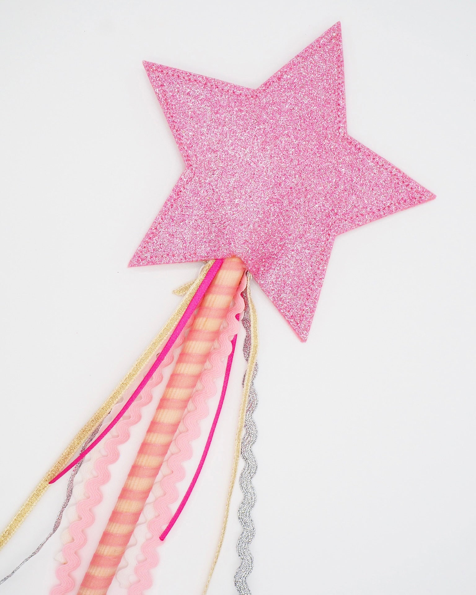 Crafted with love and care, this wand features an arrangement of sparkling pink, gold & silver ribbons, creating a stunning look that is perfect for any fairy or princess costume!