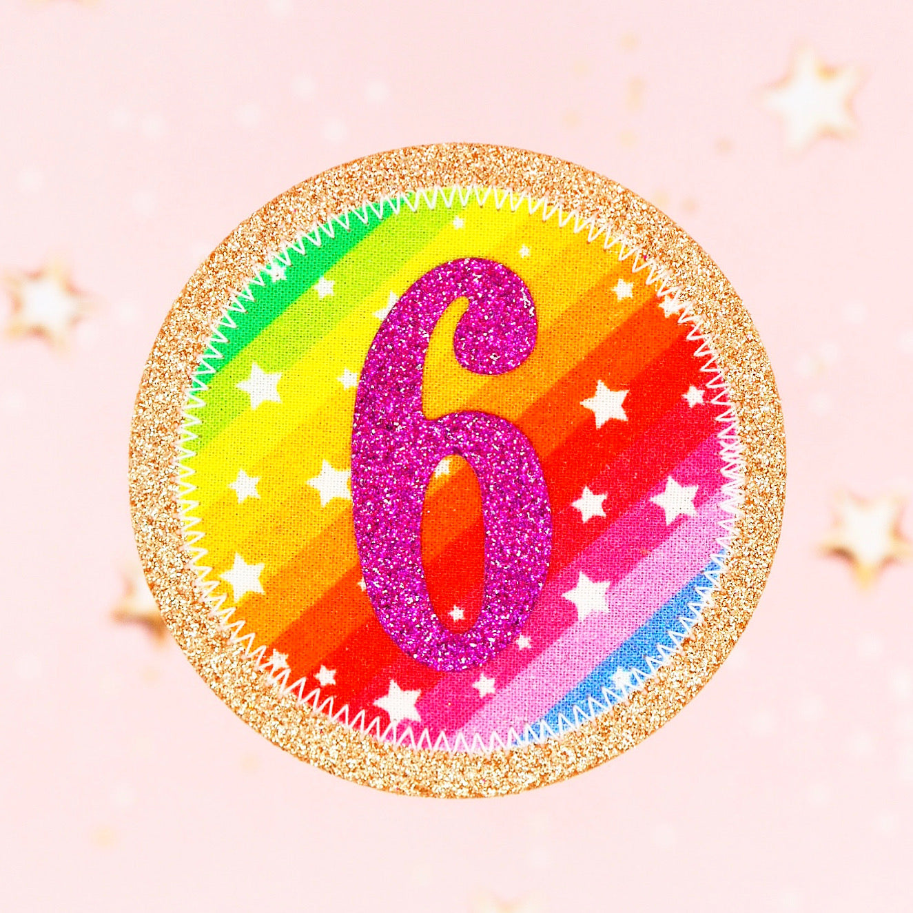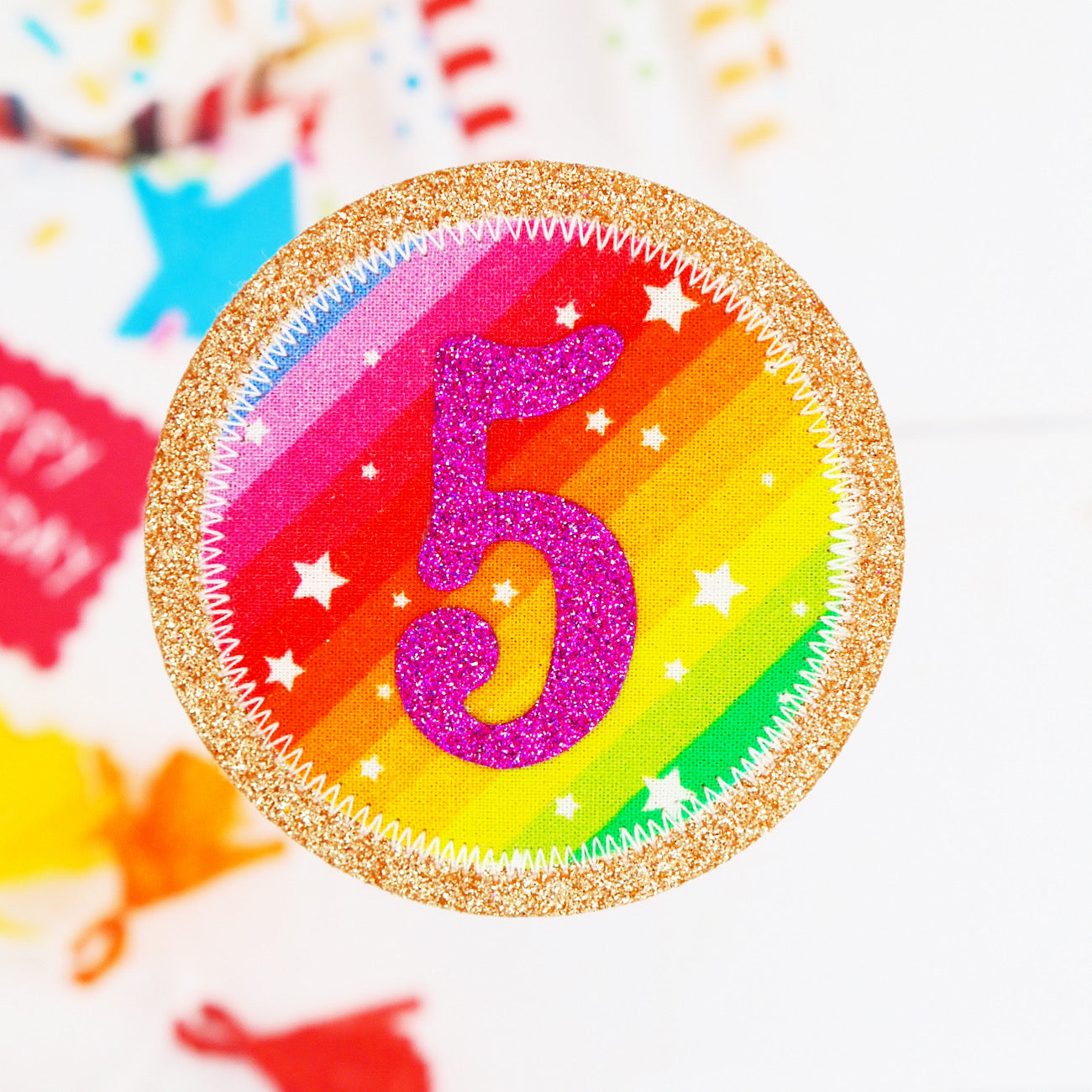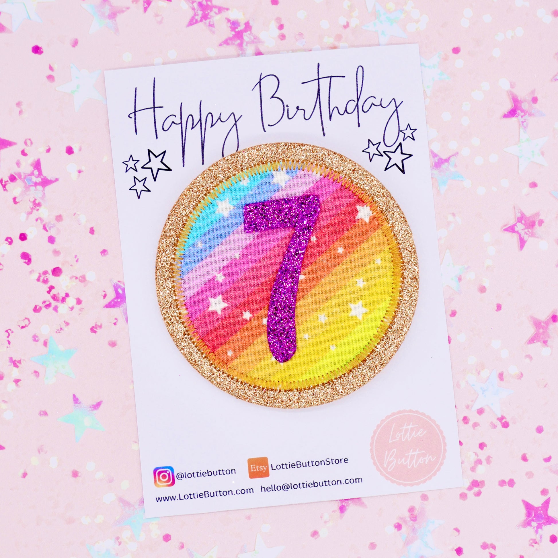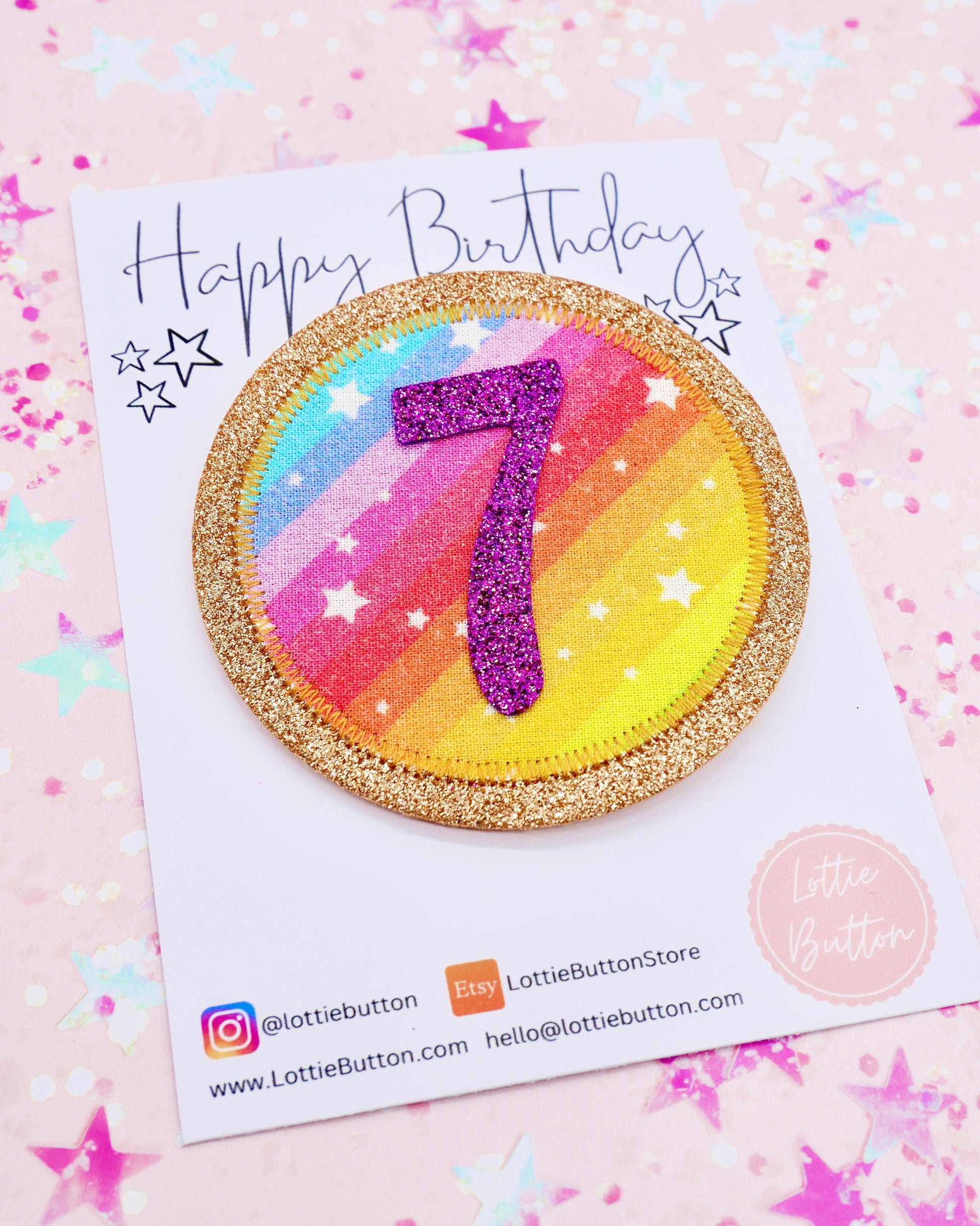 This super sparkly rainbow themed birthday badge is the perfect accessory for the big day!
