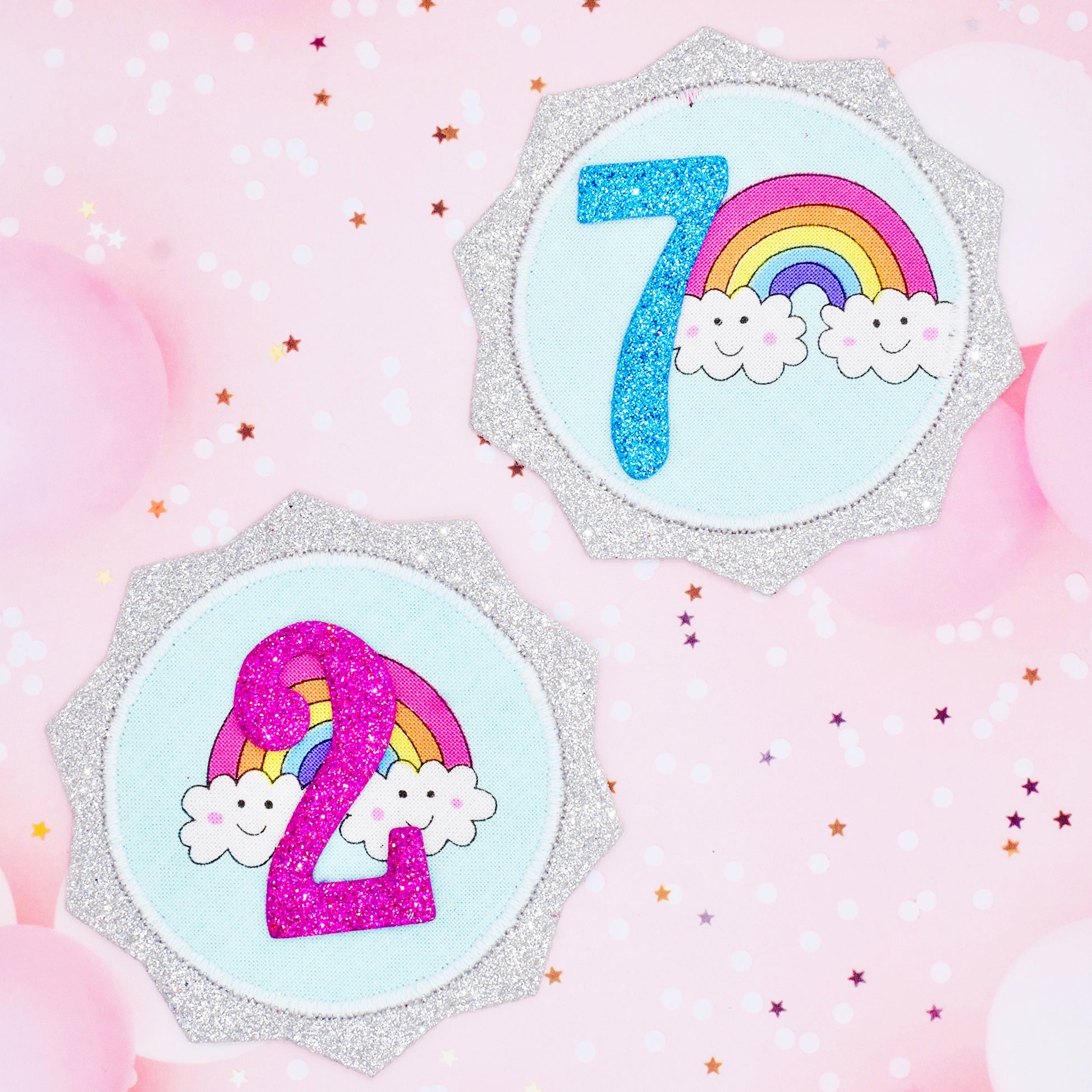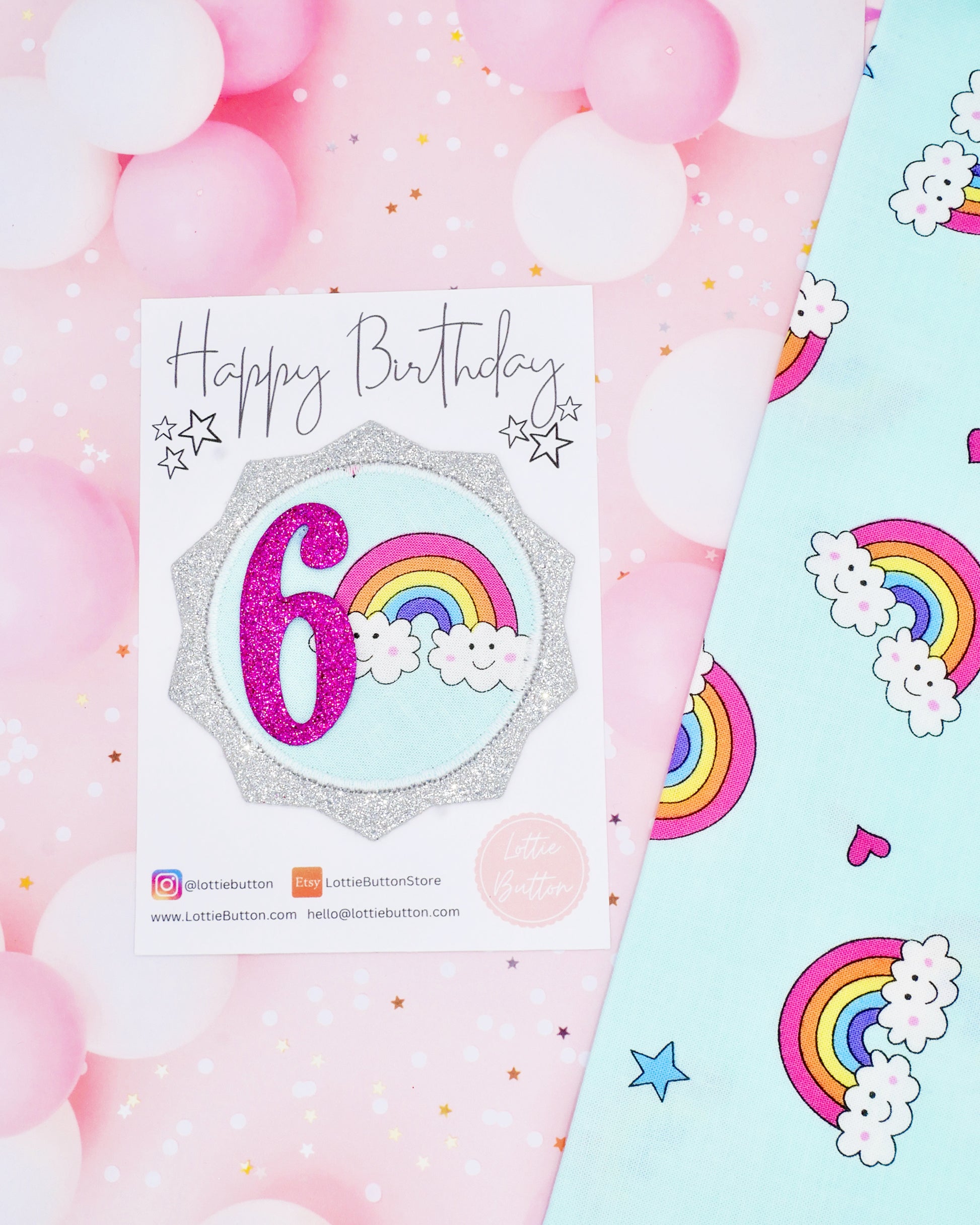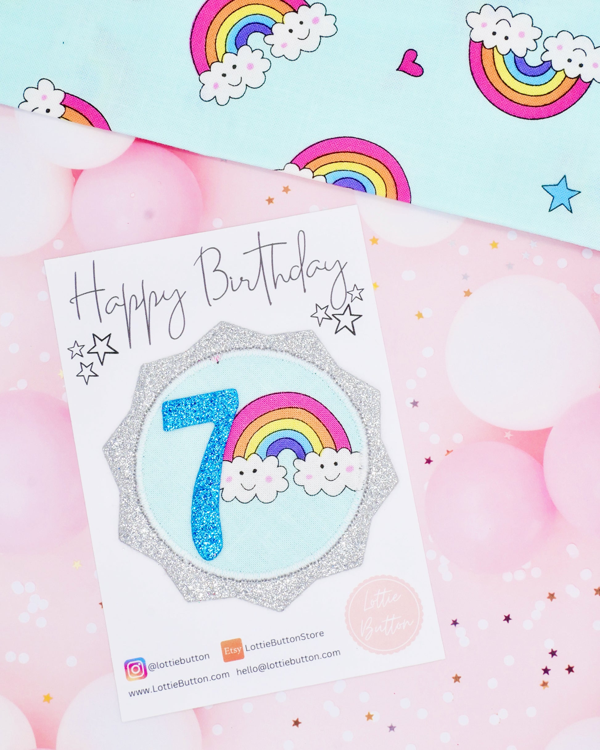 Celebrate in style with this handmade glitter felt birthday badge, featuring a stunning turquoise rainbow cloud design! Customisable with your choice of pink or blue age, this sparkly badge makes a perfect accessory for birthday celebrations.