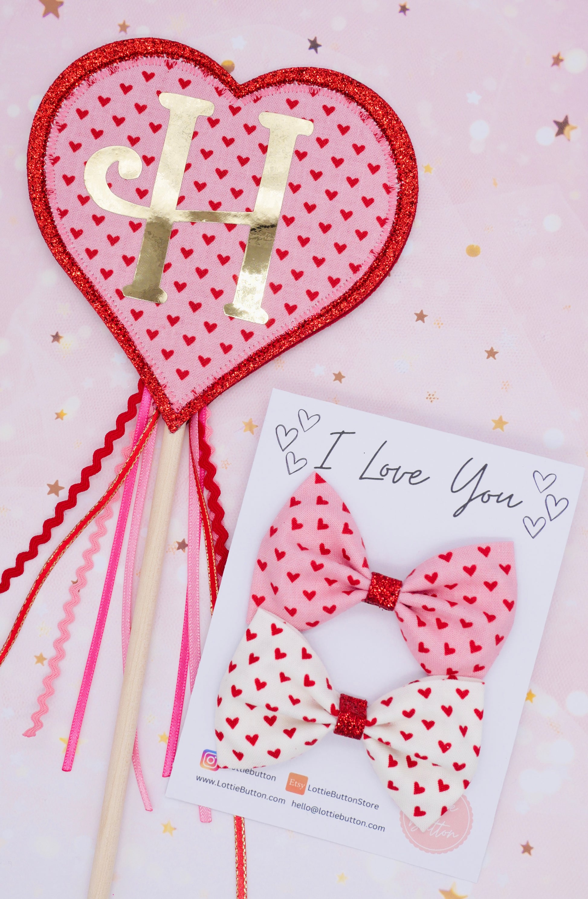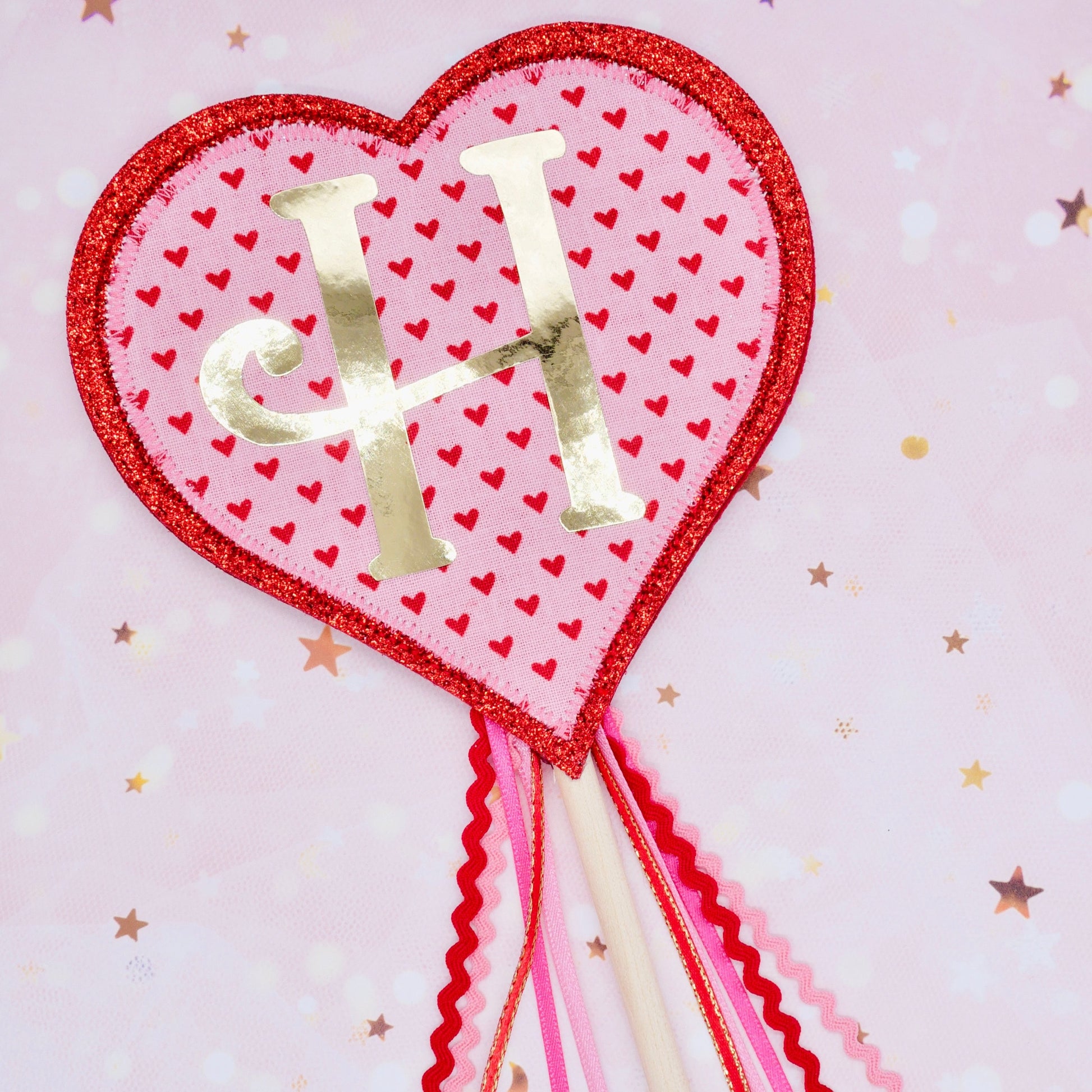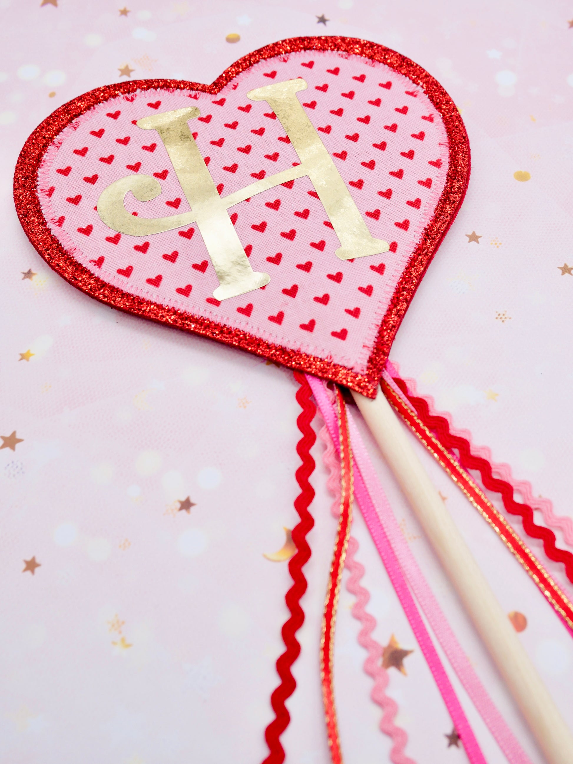 A super sparkly & super magical Valentines wand, embellished with your little ones initial along with red, pink & gold ribbons for extra twirly-ness!
